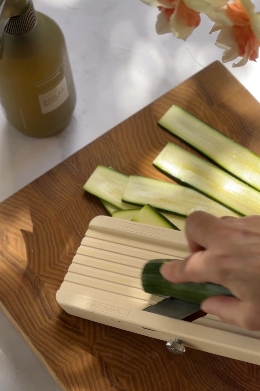 Slice the courgettes lengthways into strips 1-2mm in thickness. Spread them out onto a sheet tray, sprinkle them very sparingly with salt, and leave to sweat out the excess moisture for 20 minutes. Blot well with paper towel, until completely dry, and put aside for when ready to assemble the galette.Â