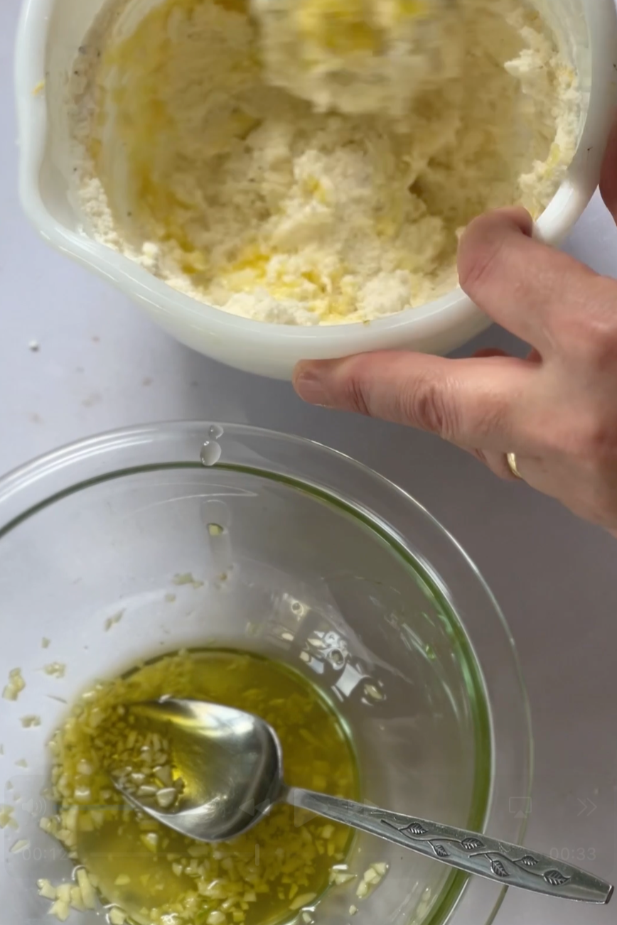 Finely chop and crush the garlic in a small bowl and whisk it with the oil. In a separate bowl whisk the ricotta, the parmesan, the lemon zest and 1 tablespoon of the garlic/oil mix.